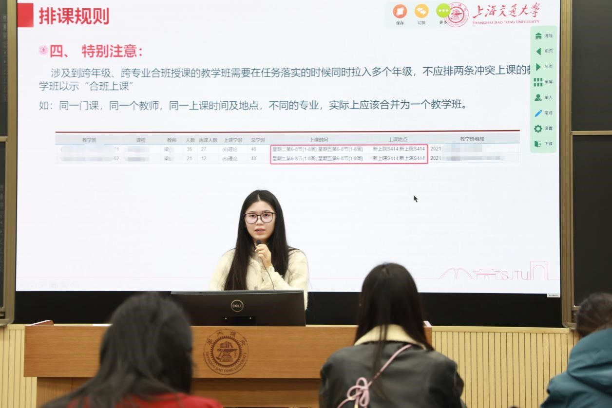 随后,张雨薇就本科生排课流程、如何调停课进行了详细讲解。她强调,排课工作须严格遵循学校总体要求,确保课表编排科学合理。她结合自身实践经验,在任务落实、排时间和地点、人数扩容等方面提出了多个注意要点,并演示了系统中的规范操作。接着,张雨薇还介绍了长期调课和临时调课的区别,如何在系统中申请,如何补课等。