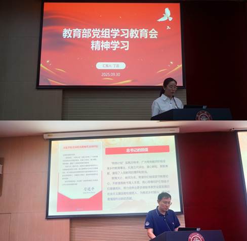 在"人人讲党课"环节,丁洁老师带领全体党员学习了教育部党组学习教育会议精神,田夏老师领学了习近平总书记给全国特岗教师代表的重要回信精神。两位老师的讲解深入浅出,引发了与会同志的热烈反响和深入思考。