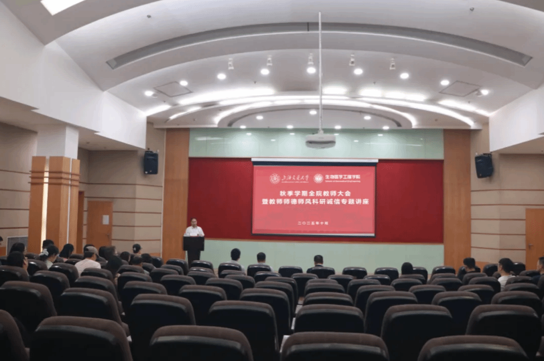 2025年10月10日下午,生物医学工程学院在闵行校区文选医学大楼一楼报告厅举行2025年秋季学期全院教师大会暨师德师风科研诚信专题讲座。学校人力资源处副处长、党委教师工作部常务副部长陈贤峰,研究生院国际化办公室主任赵凤及办公室成员陈卜侨、陈铖、薛循丹,出入境管理与服务中心副主任万芸芸、事务主管胡新怡,学院部分领导班子及教师代表出席会议。大会由学院党委书记孔令体主持。