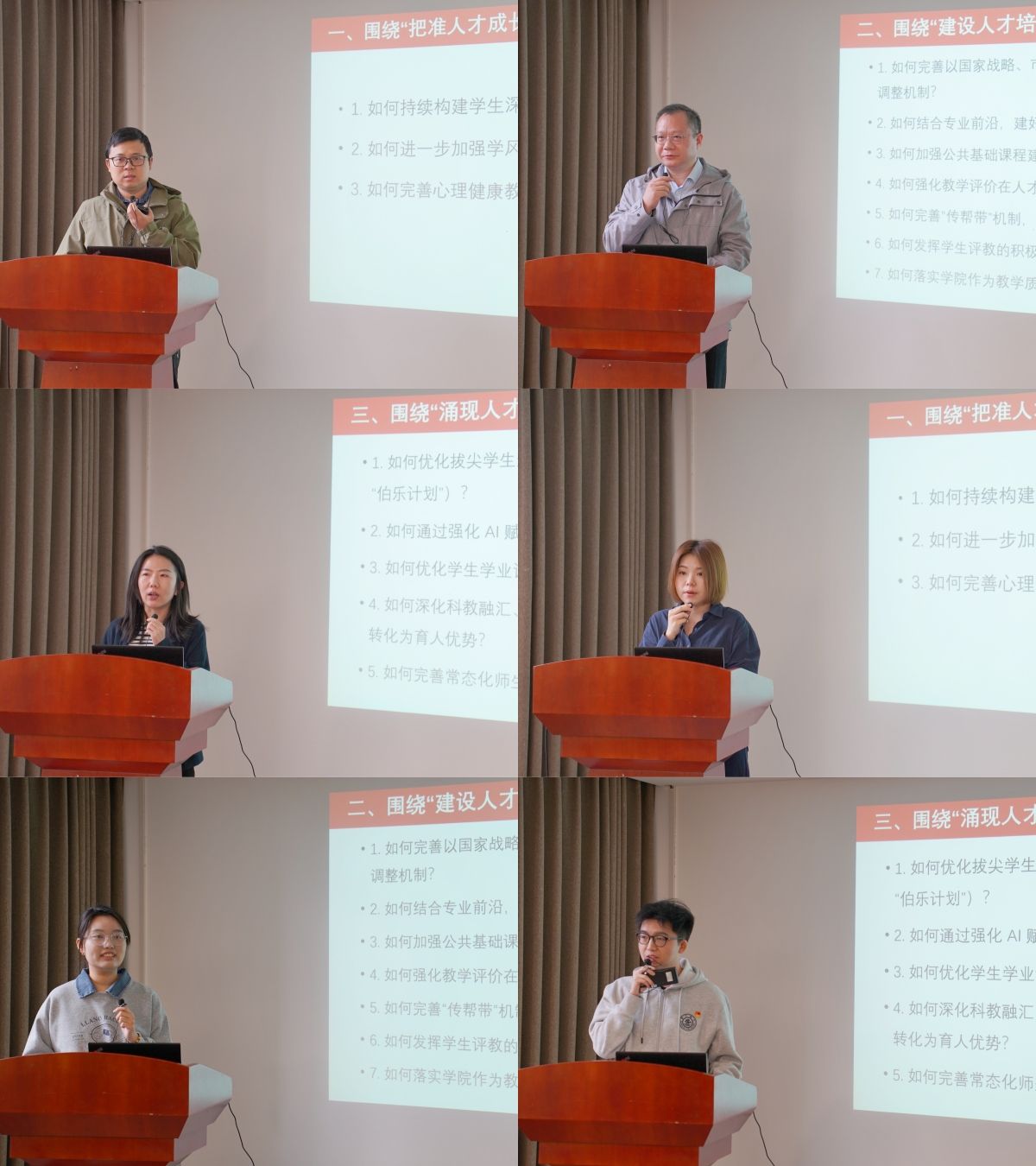 教师代表李博、陈安涛、王立卉以及学生代表郝秀荣、袁艺轩、邹昊辰围绕“把准人才成长方向”、“建设人才培养高原”、“涌现人才培养高峰”三大方面,就构建“大思政课”育人体系、课程建设、师资队伍、学生评教、学业评价、师生交流机制等关键议题进行了交流发言。与会师生踊跃建言献策,展开了积极交流与深入探讨,为进一步推动人才培养工作和学院的高质量发展提供了有效思路。