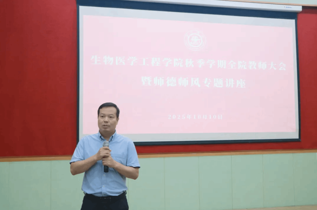 2025年10月10日下午,生物医学工程学院在闵行校区文选医学大楼一楼报告厅举行2025年秋季学期全院教师大会暨师德师风科研诚信专题讲座。学校人力资源处副处长、党委教师工作部常务副部长陈贤峰,研究生院国际化办公室主任赵凤及办公室成员陈卜侨、陈铖、薛循丹,出入境管理与服务中心副主任万芸芸、事务主管胡新怡,学院部分领导班子及教师代表出席会议。大会由学院党委书记孔令体主持。
